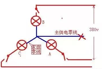 如上圖三相供電的線電壓為380v,但每一個家庭在主供電零線完好時,ABC用戶都是電壓220v,一旦主供電零線斷開,實際用電的ABC三相用戶負載不可能相同,負載電阻大的那一相用戶,得到電壓大于220v,首先負載燒毀,假設燒毀的是C,剩下的AB相如果平衡,各自分擔190v電壓,但是如果負載不平衡,電阻高的得到電壓大,如果超過220v,又將被燒毀,這時剩下的負載電阻最小的那一相,由于沒有電流,電壓是0,使得被燒毀的那兩相家庭零線與火線電壓為380v,這時這兩相用戶只要開電器必定被燒毀,所以出現電器燒毀情況,一定要等電壓正常后再開電器。
